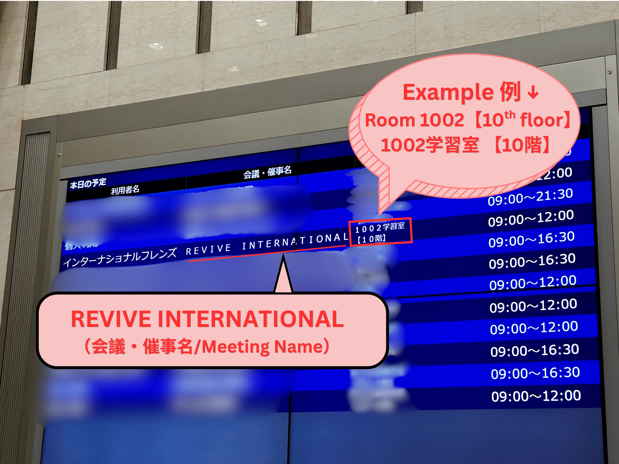 Find “REVIVE INTERNATIONAL” on the digital screen. Locate the room and floor!
